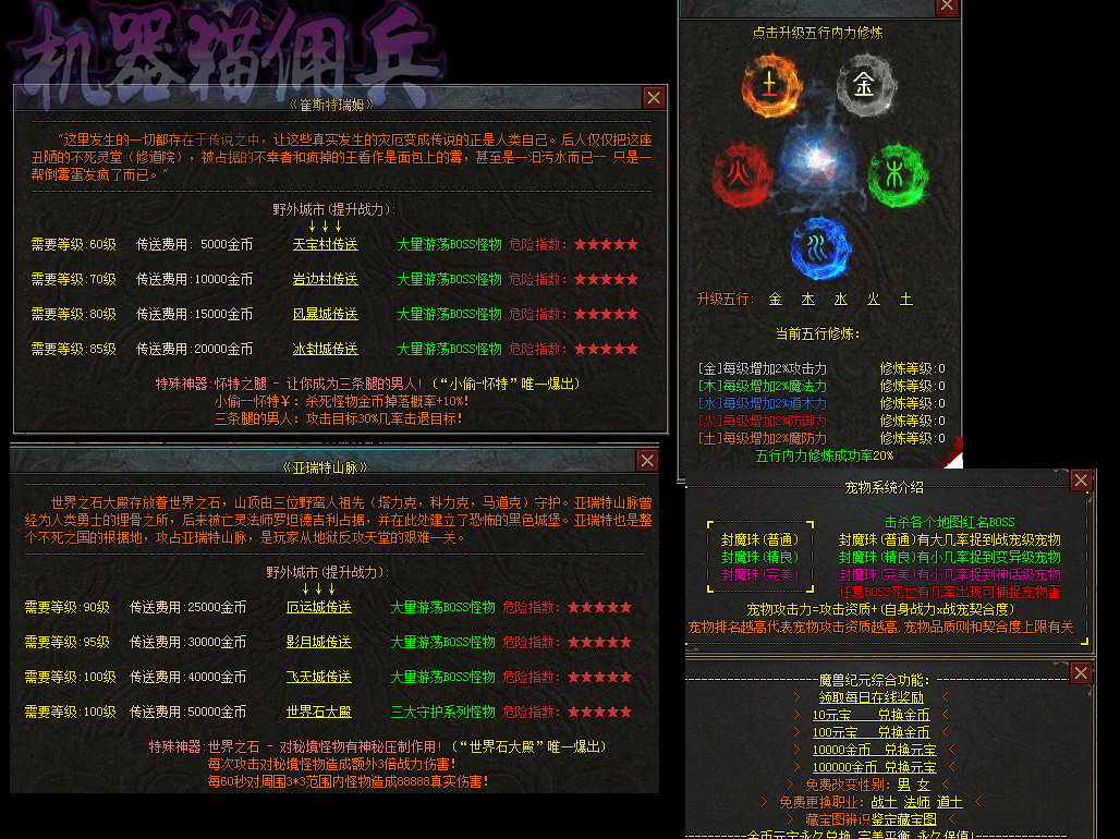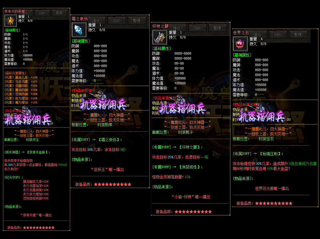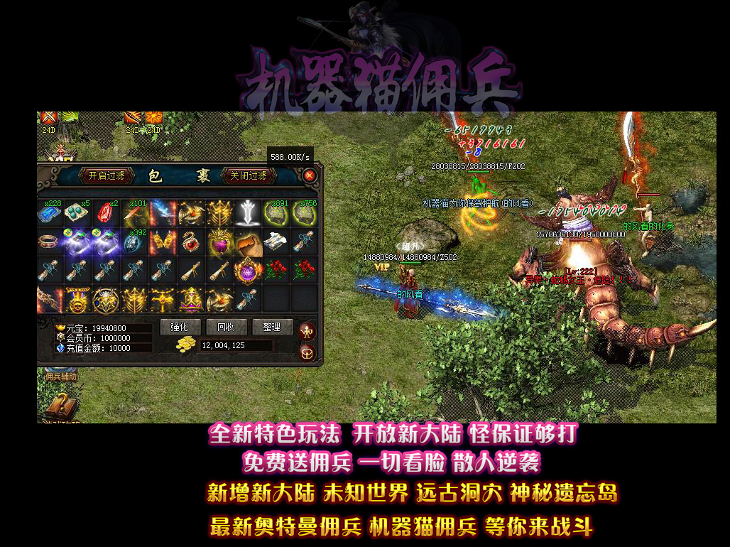 - 【机器猫佣兵】 散人有时间一样可以到终极,本服的装备是全爆的,BOSS全部掉落!花100当爷,一切靠打